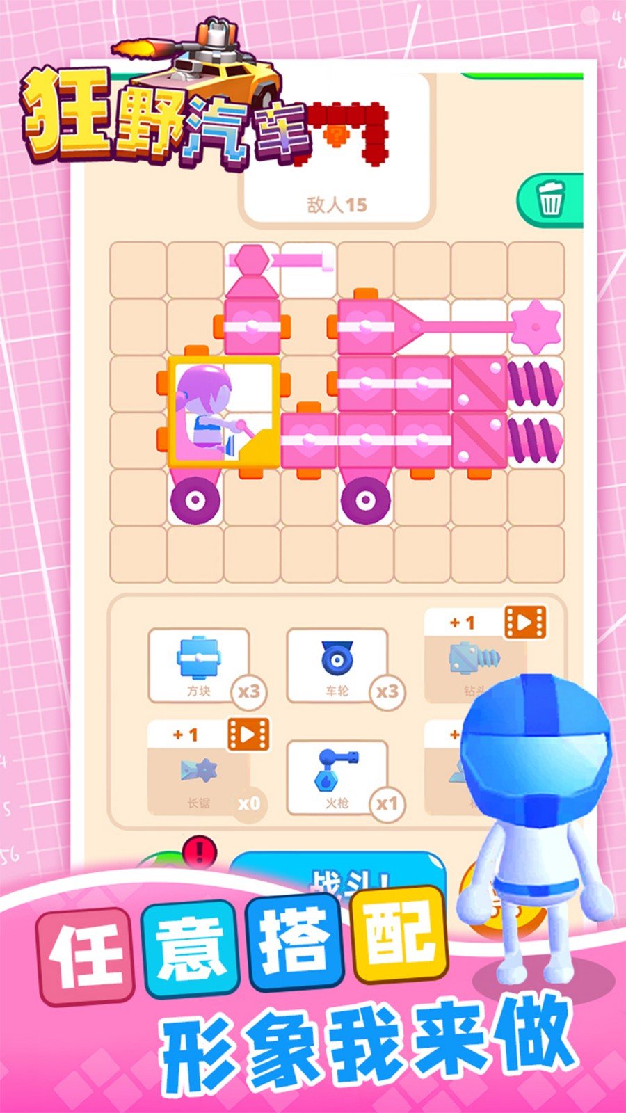 狂野汽车,画风卡通的沙盒建造游戏,在这里你可以建造自己的小车去战斗,各种配件等你去获取,自由的建造,非常的帅气,打造属于自己的专属车辆,还有自定义的小人形象,非常的好看,与对手战斗,将对手击败,获得奖励。