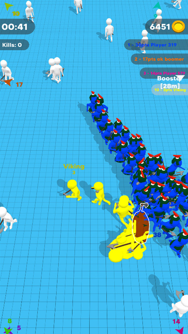 加入我方阵,游戏的玩法与贪吃蛇的玩法相似,玩家在游戏职工扮演一名维京人首领,你们各有不同的颜色,在游戏职工四处走动,招募那些白色的小人,使他们成为自己队伍的一员,不断的招募,使自己的方阵越来越大,去攻击其他玩家。
