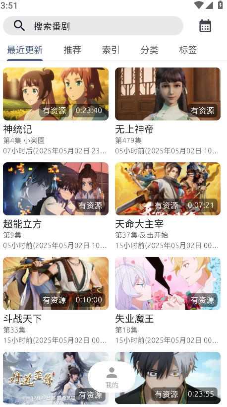 1. 点开AniCh动漫App,首页上方能看到最新的最近更新、推荐、索引、分类等板块内容。