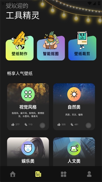 工具页面具备强大功能。壁纸制作工具助力你自由设计专属壁纸,可将个人照片或创意巧妙融入;智能抠图功能能够精准识别主体,便捷去除背景,用于制作个性头像或壁纸元素;壁纸裁剪工具能够适配各类设备尺寸,保证壁纸得以完美呈现。