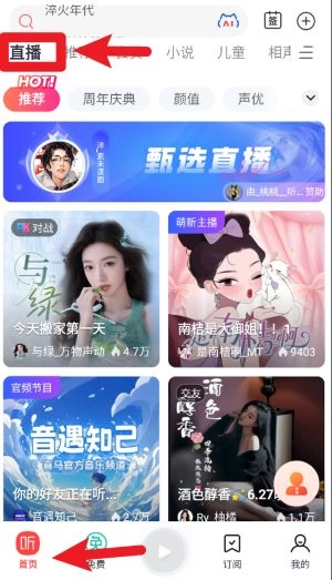 2、首页默认呈现的是“直播”界面,在此界面,用户能够浏览正在直播的相关内容,若点击直播封面,便可直接进入直播间收听直播。