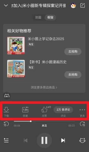 4、于播放界面,能够对倍速、音频进行调节,还可进行点赞、评论操作,同时能查看相关推荐商品,支持边听边购。