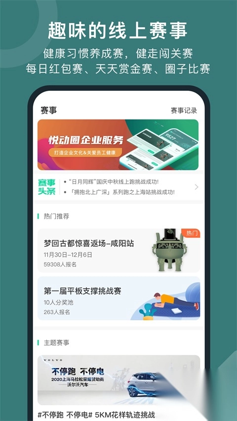 独家打造7天健康挑战赛、健走闯关赛、团队印花赛等运动赛事,让人惊喜地发现,运动原来可以这般趣味横生。