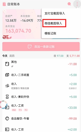 2、进入一木记账后,点击右上方,选择【微信截图导入】;