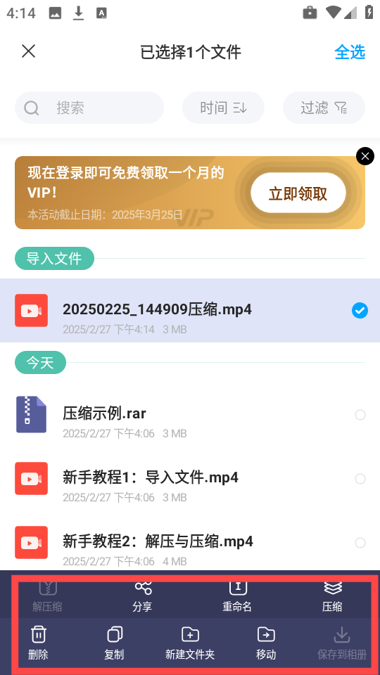 6、当选中目标文件时,底部工具栏会呈现出多种操作选项,包括删除、分享、复制、重命名、重新压缩以及移动等功能。
