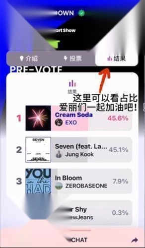 14、只需点击“结果”,就能查看占比情况啦,赶快为你心仪的idol投上一票吧!