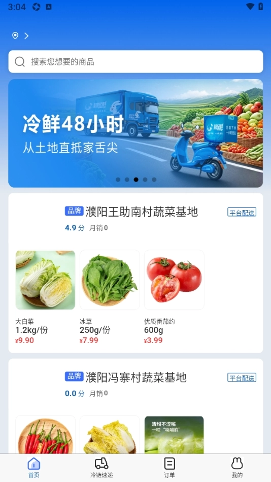 进入软件首页,即可看到可供选购的各类蔬菜基地,每个基地都有对应的评分;同时,通过顶部的搜索框输入产品名称,还能快速查询到该产品在哪些基地有售。