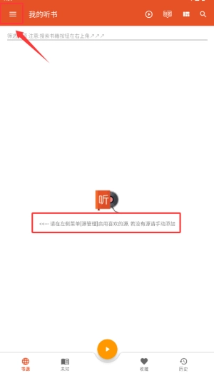 1、登录我的听书后,点击左上角菜单图标,展开功能选项列表。