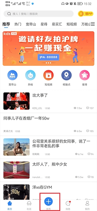 1、打开kds宽带山,在首页中点击下方栏目中的发布