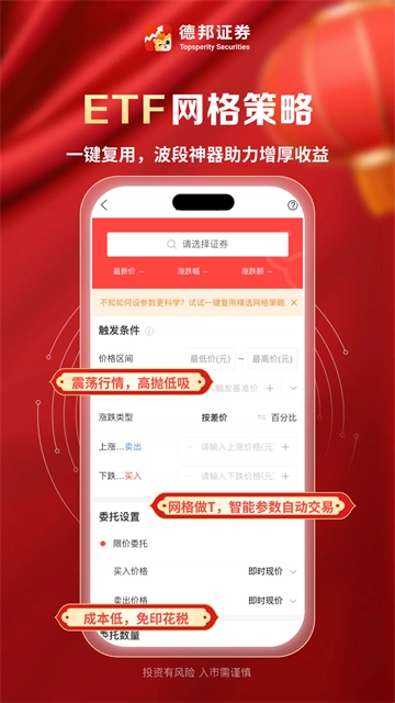 德邦证券是一款专业的手机证券理财应用,整合了行情交易、理财商城、投顾投教、7x24小时实时资讯等多元功能,更配备AI选股、智能诊股、智能盯盘、智能条件单等实用工具,助力投资者选股、交易的投资困境!用户可在此开展融资融券业务,涵盖担保品买卖、融资买入、融券卖出、还款(卖券还款、直接还款)、还券(买券还券、直接还券)、信用银证转账、信用业务查询等全流程操作,让投资模式实现升级,助财富增长突破牛熊市的周期限制。