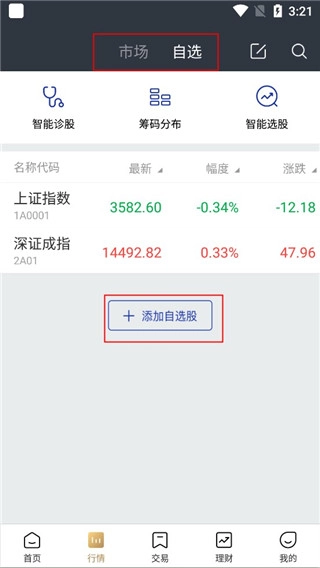 2、在“行情”中我们有市场、自选两个选择,用户可以自动添加;