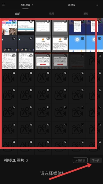 2、在媒体选择页面,从相机胶卷或素材库中勾选需要剪辑的媒体文件,勾选完成后点击下一步,进入视频剪辑编辑页面。