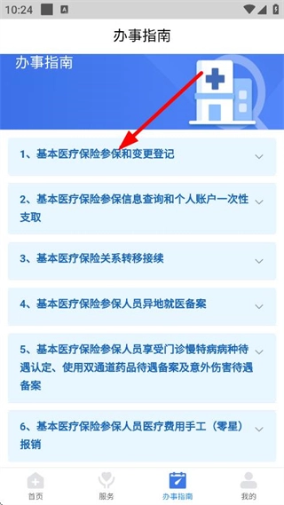1、在江西医保的首页,点击底部办事指南,进入办事指南页面。