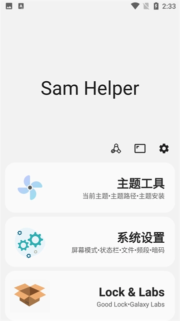 在本站下载并安装SamHelper版后,打开应用就能看到主界面上罗列着各项功能选项,你可以根据自身需求选择对应的功能来使用。
