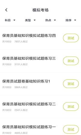 保育员考试软件配备了多样化的学习与练习功能,助力考生高效备考。软件包含学习和练习模式,考生可针对特定考点专项练习,强化对知识点的理解与掌握;其中“考试押题”作为特色练习模式,能帮助考生熟悉可能出现的题型与内容,提前做好应试准备。