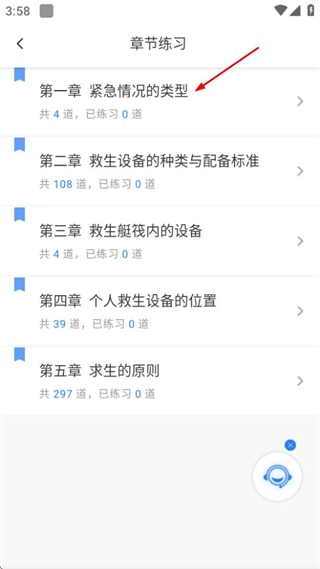4、在章节选择页面,挑选想要练习的章节(例如“第一章 紧急情况的类型”),随后进入题目练习页面。
