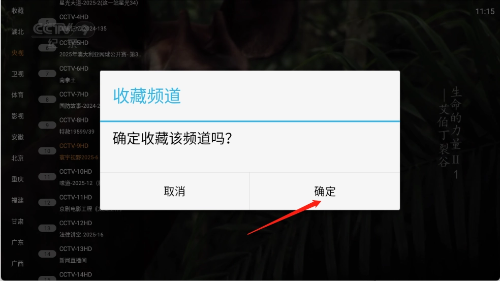 1、长按需要收藏的频道,在弹出的对话框中点击“确定”按钮。