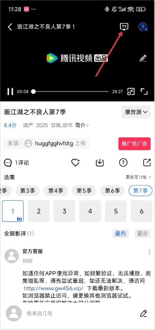 进入播放界面后,我们需要点击视频页面右上角的投屏图标。