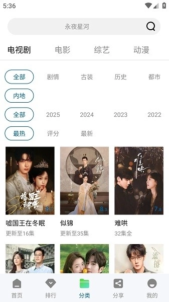 3.可按照类型(涵盖热剧、综艺、电影、动漫)、年份、地区进行分类,帮助用户快速找到想要观看的内容。