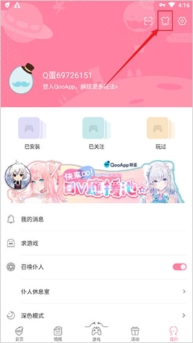 1、打开QooApp软件后,找到右下角我的,并点击;