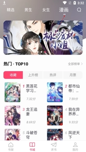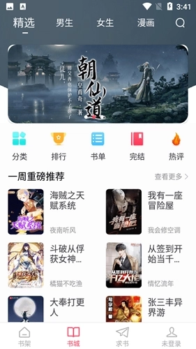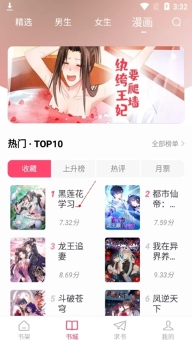 1、软件进入书城精选页面后,能看到精选、女生、男生、漫画等分类,还有排行、书单、完结、热评小说漫画板块。