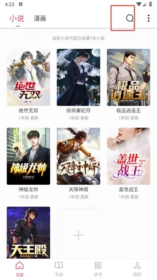 1、第一步是打开小小追书应用,进入首页后能看到各类小说,此时我们点击页面右上方的【搜索图标】即可。