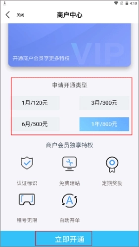 (2)你选择你申请开通的类型,了解商户会员独享的特权,然后点击立即开通。
