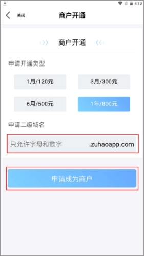 (3)接下来是申请你网站的二级域名,按照提示输入你拟定好的名称后,点击“申请成为商户”按钮,之后等待工作人员的审核通知就行。