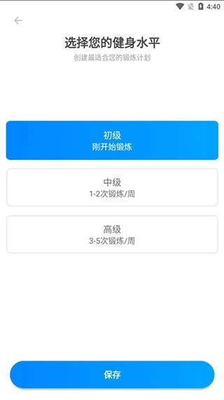 1、进入,选择你的健身水平,并且根据自身的体质来创建合适的锻炼计划;