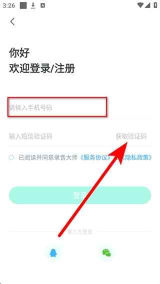 4、将收到的短信验证码填入验证码输入框,勾选协议后,点击登录,即可完成账号登录。