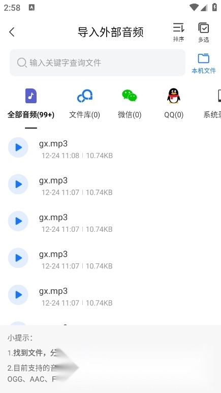 2. 请确保已开启手机存储权限,否则无法成功导入音频;