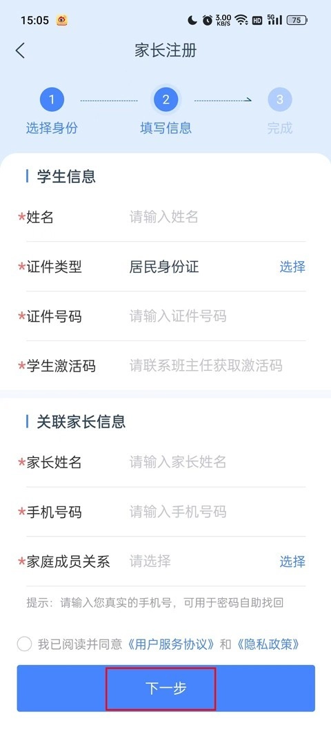 三、进入信息填写页面后,先完成【学生激活码】等关键信息的录入,接着勾选相关协议,然后再次点击【下一步】,如果所填信息准确无误,就能顺利完成注册流程。