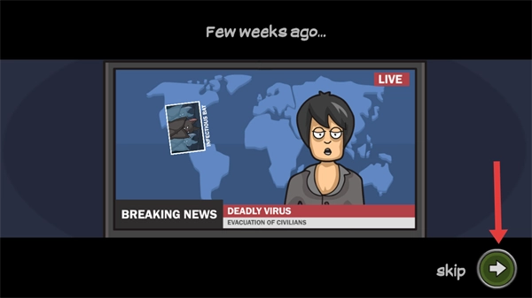 1、游戏开场出现新闻剧情,点击【skip】按钮跳过,快速进入游戏实际操作环节。