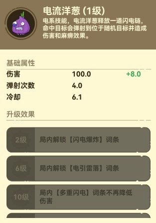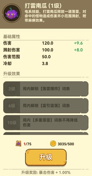电系技能中,打雷南瓜会释放一道雷电,这道雷电命中敌人后不仅会造成伤害,还会引发小范围的溅射效果,同时附带麻痹状态。