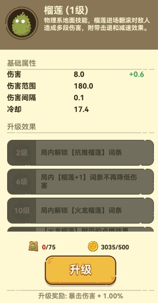 物理系地面技能,榴莲滚动进入战场时会对敌人造成多次伤害,并带有击退和减速的效果。
