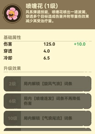 风系弹道类技能,喷嚏花会喷射出一股强劲的气流,这股气流能够穿透多名敌人并对其造成伤害,与此同时还会附带重伤状态,以此来削弱敌人的恢复能力。