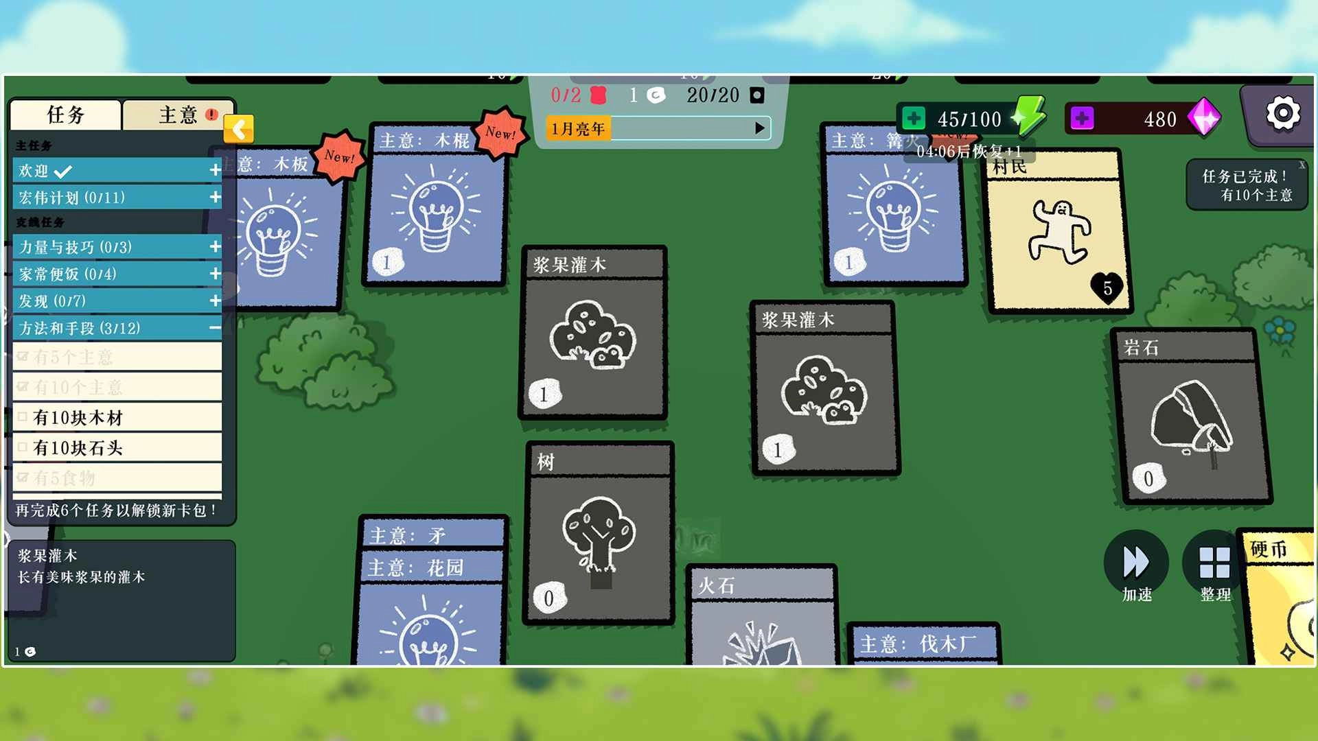 3、左边列着好几个任务,像击碎一块岩石这类的,别忘了去完成,另外下方还有加速的功能可以用。