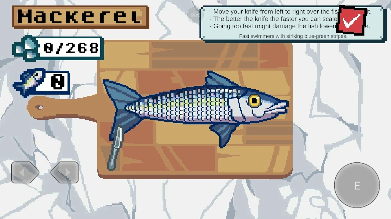 游戏玩法看似轻松惬意,实则藏着不少操作门道。玩家手持的刀具会左右刮鱼鳞的速度,不同款式的刀用起来手感也各有差异;钓钩的类型决定了单次能钓上几条鱼,鱼线还能通过升级去探索更深的海域,让玩家体验到更丰富的海洋经营乐趣。