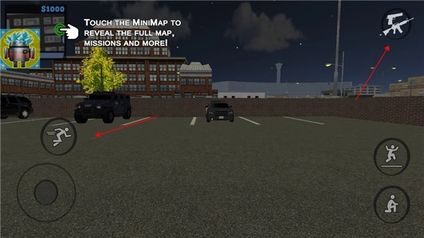 2、玩家可以自由操作角色奔跑和跳跃,右上角可以选择游戏武器;