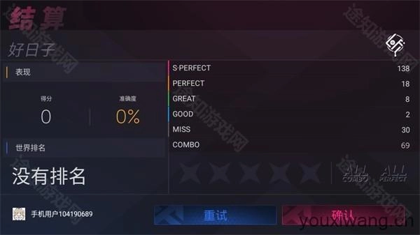 5、歌曲进度显示在屏幕最顶端,一旦进度条填满,闯关便会结束;通关后系统会依据玩家所得分数给出相应的评分。