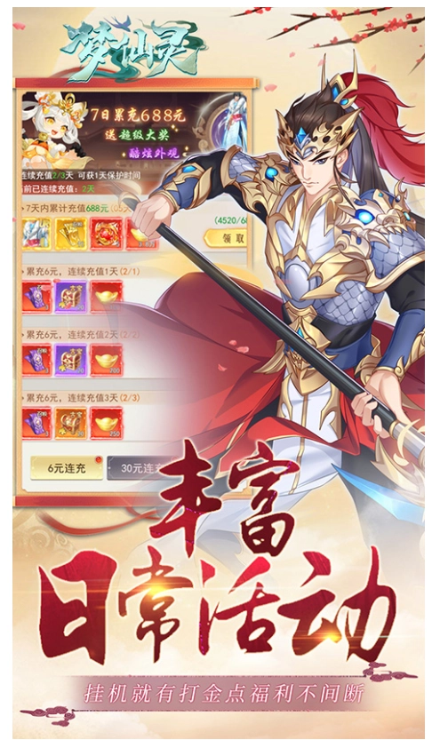 2、游戏内设有海量福利活动,无论是VIP专属特权,还是各类元宝、材料等资源,都能通过参与福利活动免费获取。丰富的游戏奖励让您轻松拿到手软,玩家还可通过挂机玩法领取更多奖励,游戏体验十分耐玩。