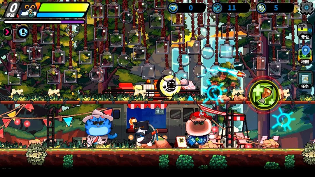 3、这里不仅有软萌猫咪陪伴左右,还有狡黠的龙鸟、狂暴的猩猩、呆萌的火龙果等各具特色的角色,它们能近战能远击,无论是格斗还是走位,都样样精通。