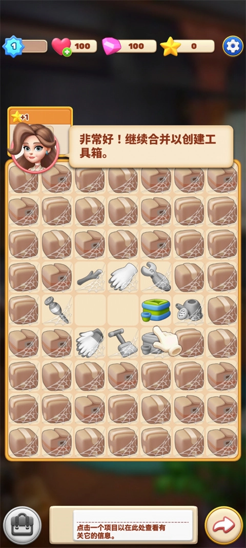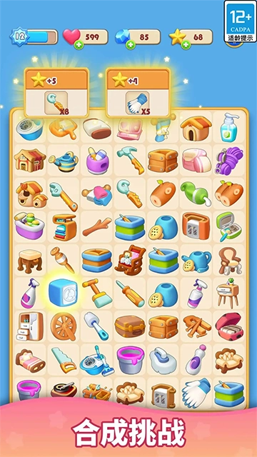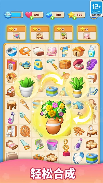 把拼图游戏板上相同的两个元素合并起来,就能创造出新的物品与工具,用来翻新客厅、卧室、厨房、花园和温室之类的各类房间。