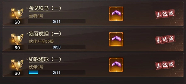 2、伙伴培养:玩家可以通过提升坐骑、伙伴的等级和阶级来获得成就,领取钻石奖励。