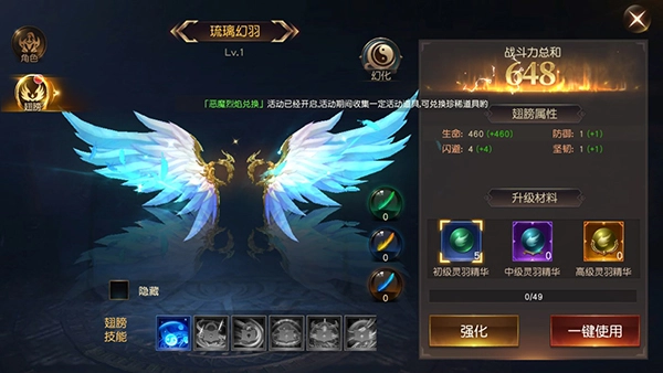 2、玩家还可以使用升级材料给翅膀升级强化,提高翅膀属性等级,增加属性加成。