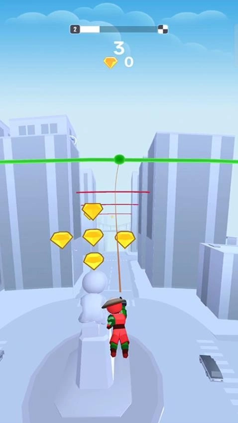 1、核心玩法围绕绳索发射展开,玩家需要点击屏幕瞄准目标平台,借助拖拽操作来调整发射的力度与方向,松开后角色便能借助绳索的力量完成飞跃;若能精准落在目标平台上,还可触发加速效果。