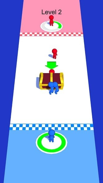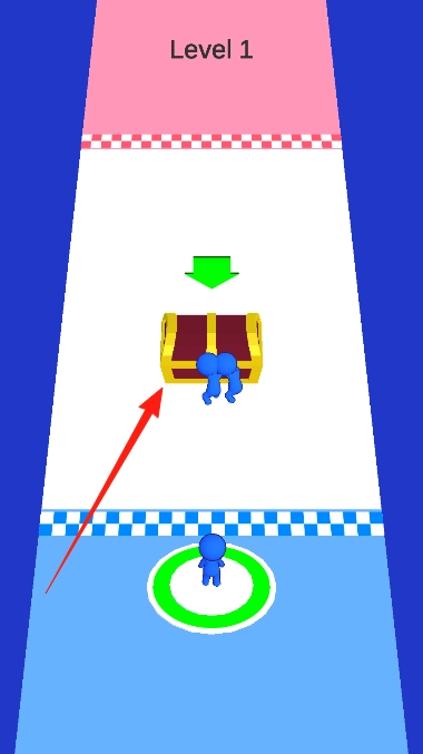 1、操控底部小人蓝色,吸引沿途队友蓝色小人,靠近宝箱,形成人群推动。