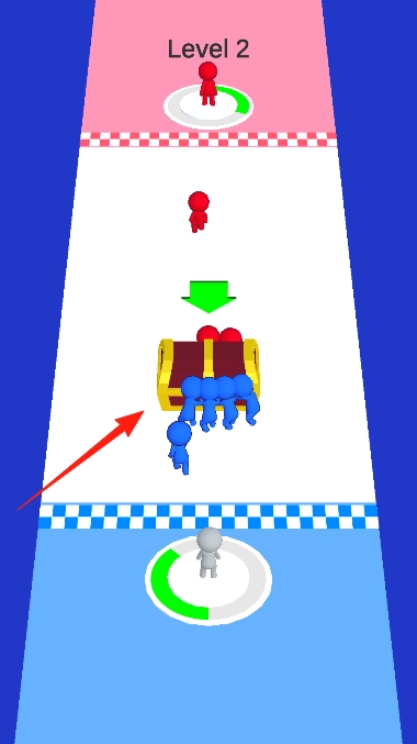 3、集结蓝色人群推宝箱,避开红色敌人红小人,将宝箱推至终点,积累人群数量是关键。