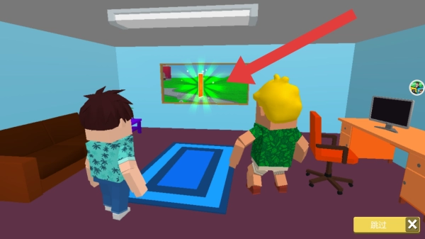 1、呈现了卡通风格的室内场景,点击跳过的按钮,属于该平台丰富创意的一幕,利用其沙盒创作特色构建出独特画面。