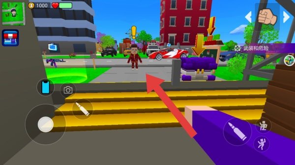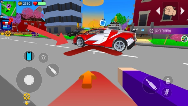 3、画面呈现出卡通风格的开放世界场景,还有买任何手枪的任务提示,属于沙盒城市冒险战斗类玩法的画面。